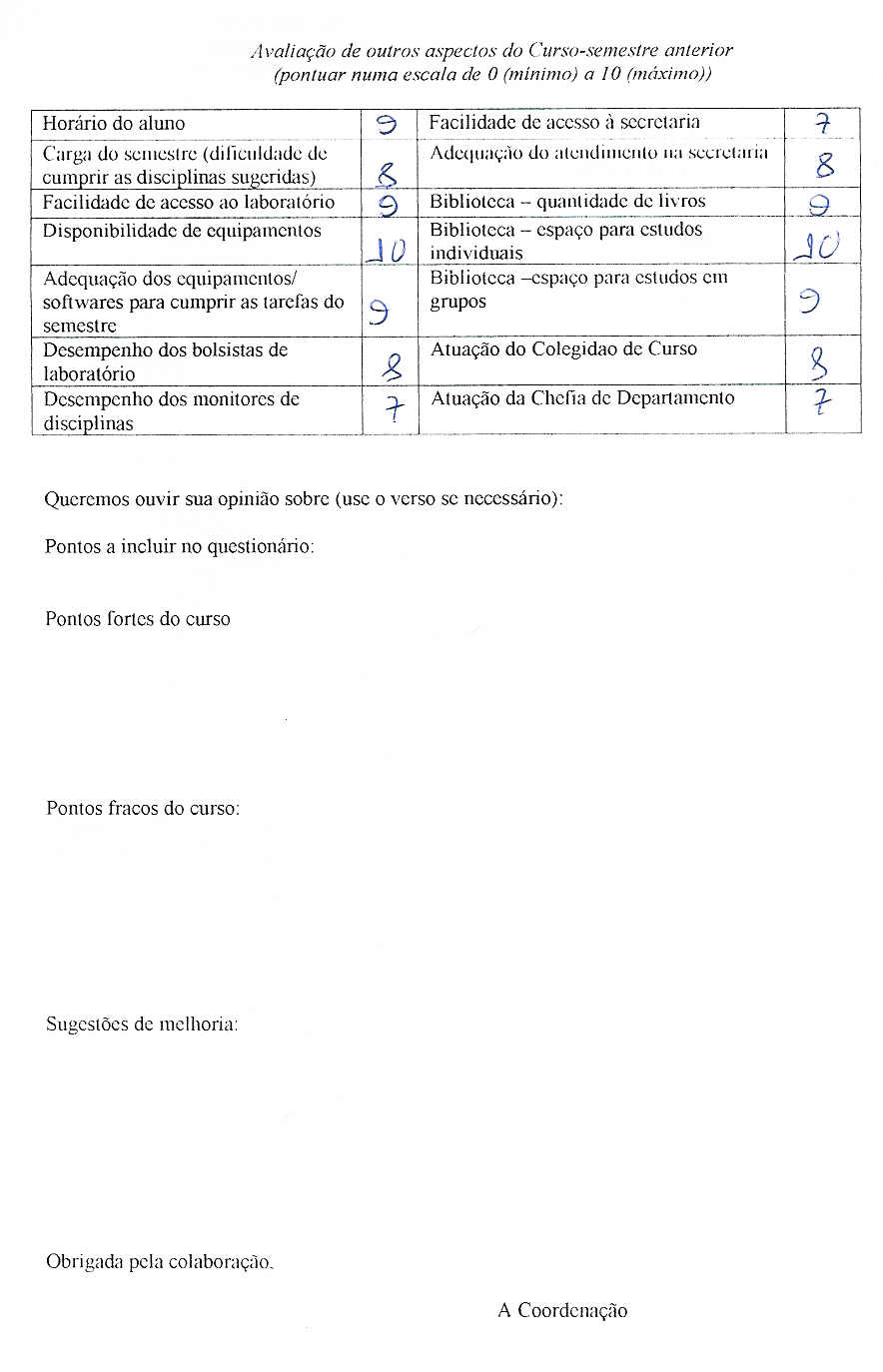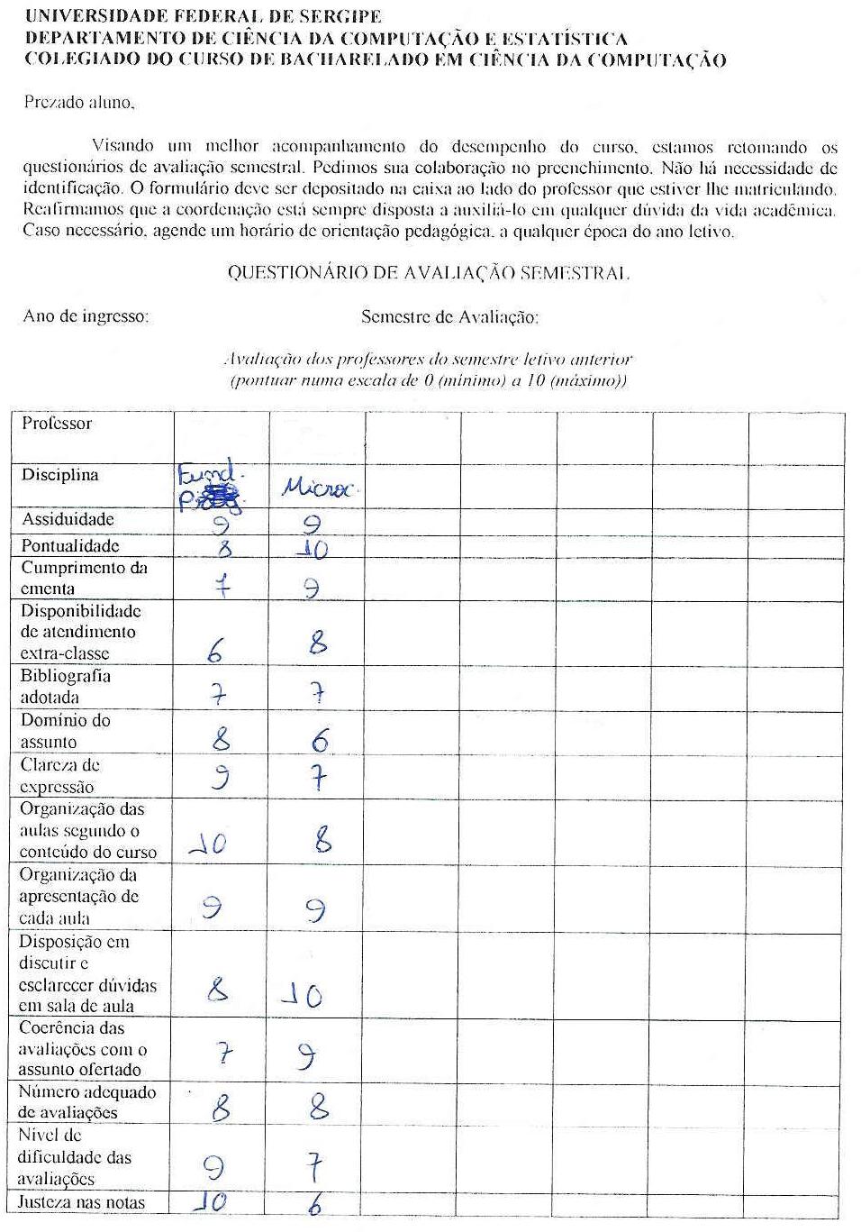 | 9 | Preencher Formulário de Avaliação | O aluno preenche os campos com todas as notas. Todas as notas são números inteiros entre 0 e 10. Após o preenchimento as notas devem ser validadas e caso ocorra algum erro, o aluno deve ser informado. Quando todas as notas informadas forem válidas, será apresentado o formulário todo preenchido para que o aluno possa concluir o preenchimento. Quando o formulário for preenchido o Administrador recebe um e-mail de notificação. |