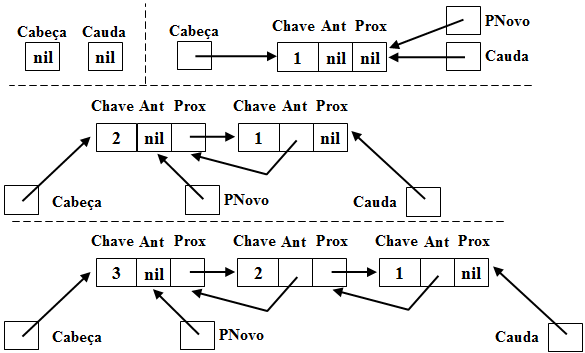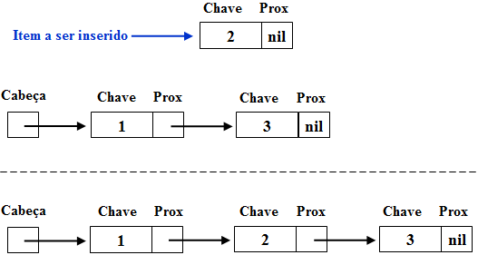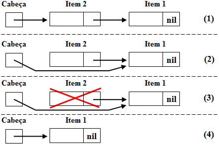 Inicialmente a cabeça da lista aponta para nil, indicando que a mesma está vazia (1). Após a inserção do um Item 1 na lista, a cabeça aponta para ele, e o apontador para o próximo Item contido no Item 1 aponta para nil, já que após ele não há outros itens (2). Caso um outro elemento (Item 2) seja inserido, ele passa a ser a cabeça da lista e seu apontador para o próximo elemento da lista aponta para a antiga cabeça da lista (Item 1), como pode ser verificado em (3).