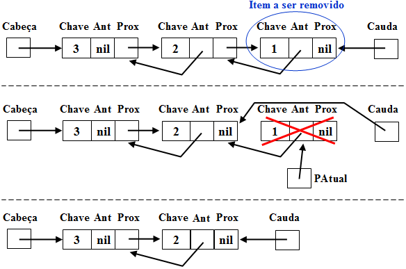 Quando o item a ser removido não se encontra na cabeça da lista, é necessário atualizar o apontador do item anterior. Sendo assim, usamos um apontador (PAtual) para procurar o Item a ser removido e outro (PAnterior) para guardar o Item anterior na lista encadeada. Desta forma, ao encontrar o Item (1), temos um apontador para o item anterior a ele (PAnterior) e para o próprio item (PAtual), como mostra (2). De posse destes apontadores, podemos ajustar o apontador para o próximo do item apontador por PAnterior para o endereço apontado pelo campo próximo do item apontado por PAtual. Em seguida, usamos o dispose para desalocar a variável dinâmica que guarda o item removido (3). Ao final, temos uma lista encadeada com um item a menos e com todos os apontadores ajustados.