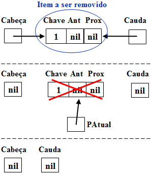 A função Remover apaga um nó da lista e ajusta os apontadores (cabeça, cauda, anterior e proximo) quando necessário