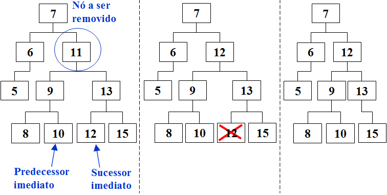 Nesse caso é necessário encontrar o sucessor imediato, copiar o seu conteúdo para o nó a ser removido e remover o nó que continha o sucessor imediato.