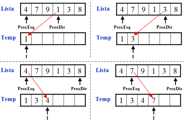 O procedimento MergeSort utiliza um procedimento chamado Merge que recebe duas listas ordenadas, faz a cópia para uma lista temporária na ordem correta e no final copia os elementos de volta para a lista (antes era dividida em duas sublistas ordenadas).
