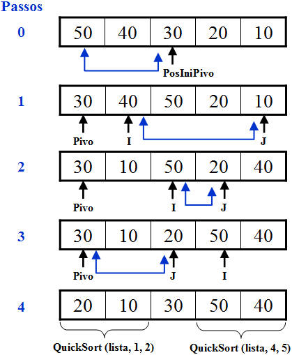 Para executar uma determinada partição foram introduzidos dois apontadores (indicadores): o primeiro (I) começa na posição 1 do segmento e percorre para a direita; o segundo (J) começa no final do segmento e o percorre para a esquerda. O apontador (I) procura elementos maiores que o pivô e o apontador (J) por elementos menores ou iguais ao pivô. O processo termina quando o apontador (I) é maior ou igual ao apontador (J).