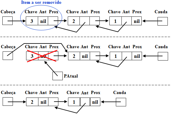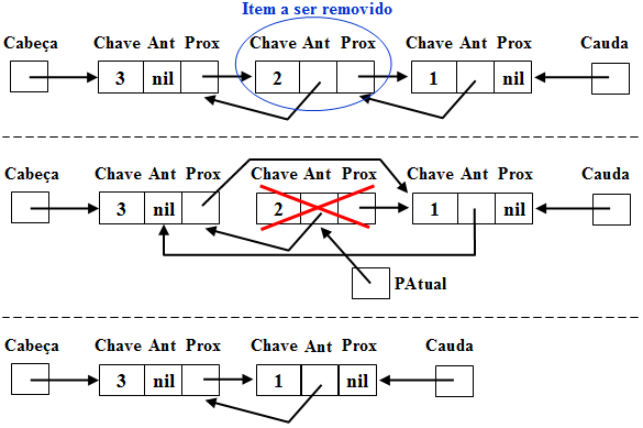 Quando o item a ser removido não se encontra na cabeça da lista, é necessário atualizar o apontador do item anterior. Sendo assim, usamos um apontador (PAtual) para procurar o Item a ser removido e outro (PAnterior) para guardar o Item anterior na lista encadeada. Desta forma, ao encontrar o Item (1), temos um apontador para o item anterior a ele (PAnterior) e para o próprio item (PAtual), como mostra (2). De posse destes apontadores, podemos ajustar o apontador para o próximo do item apontador por PAnterior para o endereço apontado pelo campo próximo do item apontado por PAtual. Em seguida, usamos o dispose para desalocar a variável dinâmica que guarda o item removido (3). Ao final, temos uma lista encadeada com um item a menos e com todos os apontadores ajustados.