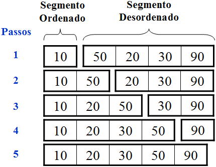 Neste método os elementos da lista são divididos em dois segmentos. Inicialmente, o primeiro segmento contém apenas o 1º elemento (a1) estando portanto classificado. O segundo segmento, formado pelos elementos a2, a3, ..., an (sendo n o número de elementos da lista) continua sem ordenação.