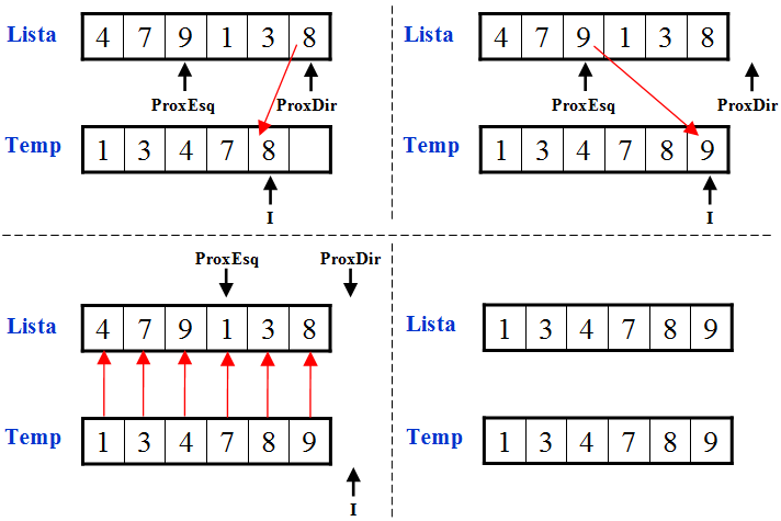 O procedimento MergeSort utiliza um procedimento chamado Merge que recebe duas listas ordenadas, faz a cópia para uma lista temporária na ordem correta e no final copia os elementos de volta para a lista (antes era dividida em duas sublistas ordenadas).