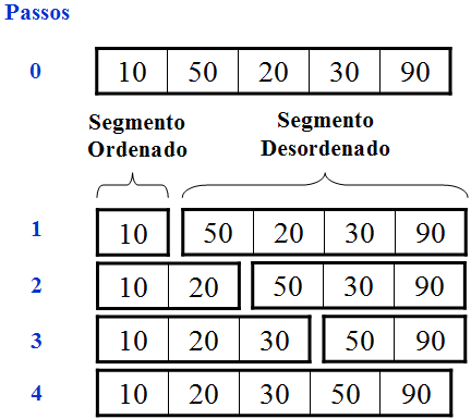 Definição: Nos métodos de classificação por seleção a ordenação é efetuada pela seleção sucessiva do menor valor da lista. A cada passo o elemento de menor valor é colocado em sua posição definitiva na lista classificada e o processo é repetido para o segmento que contém os elementos não selecionados.
