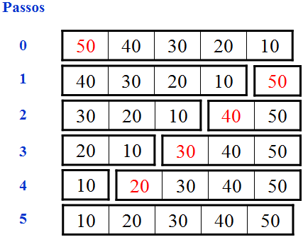 Em cada passo, o valor é borbulhado para a última posição do segmento da lista considerada.